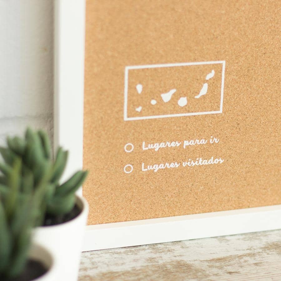 Decora las paredes de tu casa con un cuadro de España de corcho. Elige entre el color blanco o negro para el marco y el diseño y piensa un lugar de tu casa donde los vas a colgar. ¿Lo tienes? Ahora ya solo queda pinchar las chinchetas que vienen incluidas en el mapa y colgar tus fotos estilo vintage.