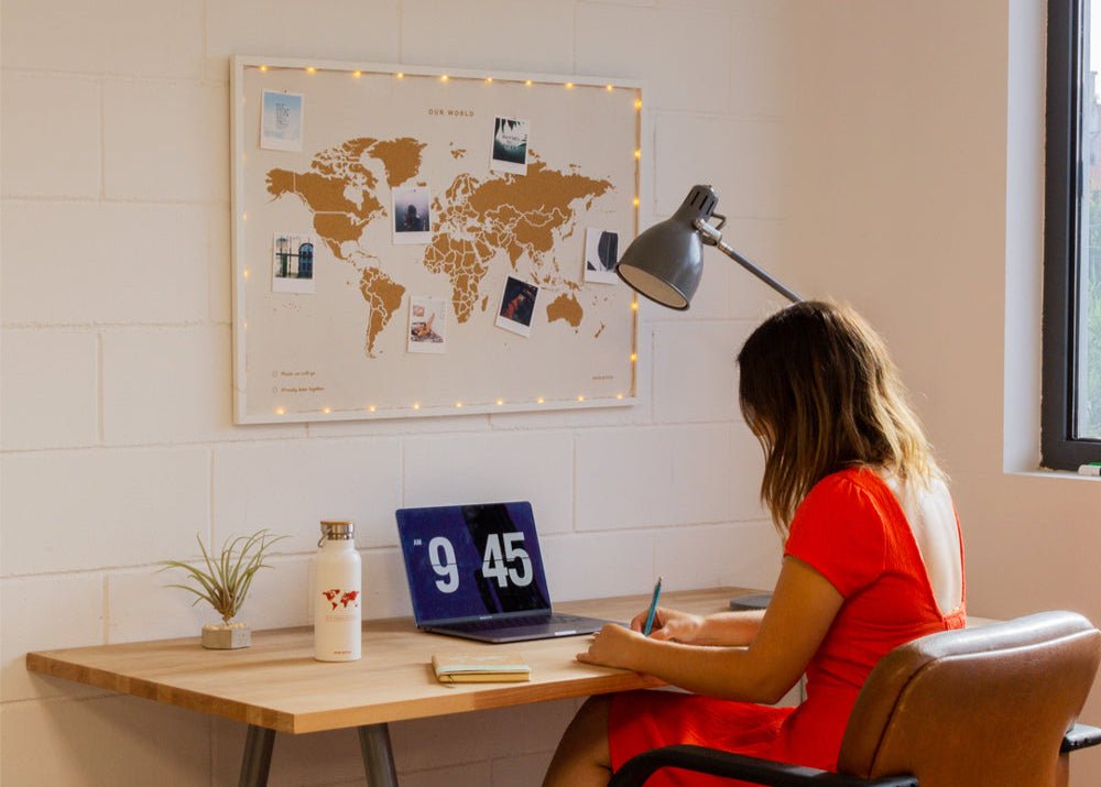 Nuestro mapamundi de corcho con marco 100% hecho a mano en Barcelona, acompañado de nuestras luces led para iluminar tu mapa. Un rincón único en casa para recordar lo vivido... y soñar lo que queda por vivir.